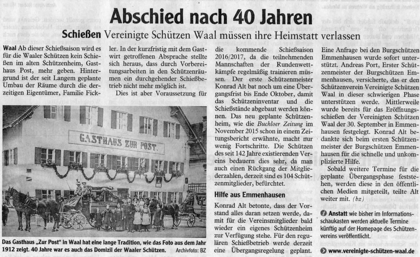 2016 | Am 14.10.2016 räumen die Mitglieder des Schützenvereins das Schützenheim im Gasthaus Post. Übergangsweise findet das Schiessen im Dorfhaus Emmenhausen bei den Burgschützen statt. | |