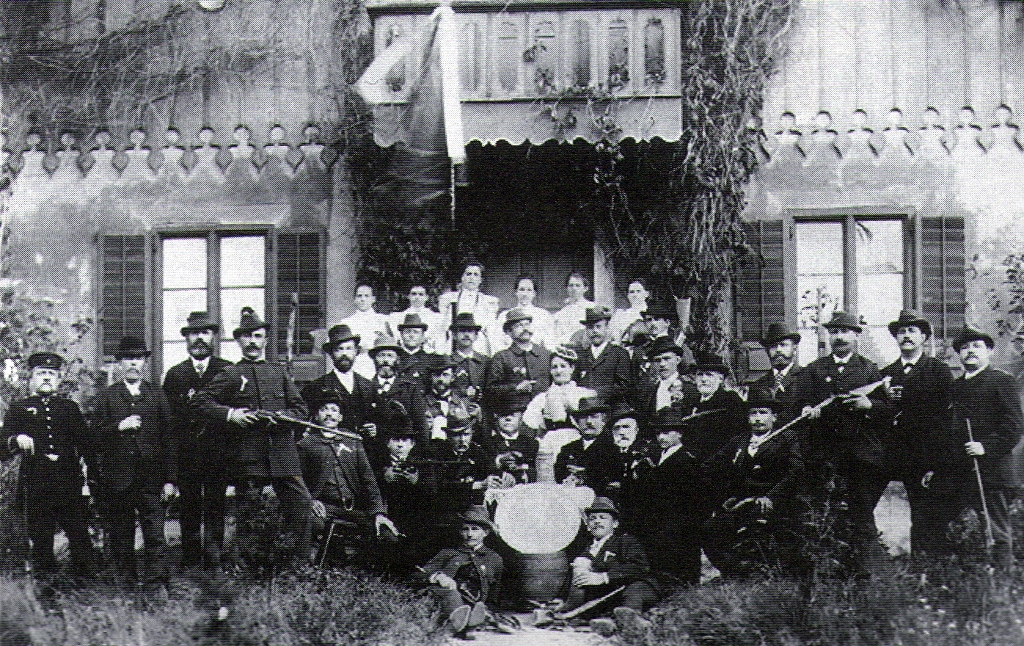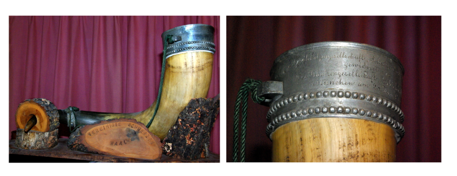 1875 | Am 28 Juni trafen sich die Schützengesellschaft "Schiesshütt'n" (*verm. aus München) mit der Schützengesellschaft "Schützenlust". Bei diesem Treffen wurde dem Verein ein verziertes Horn gewidmet, welches mit einer Inschrift versehen war. Dieses Horn findet man immer wieder auf historischen Fotos, u.a. beim 25- und 50-jährigem Bestehen. Das Horn befindet sich bis heute im Besitz des Schützenvereins. | |