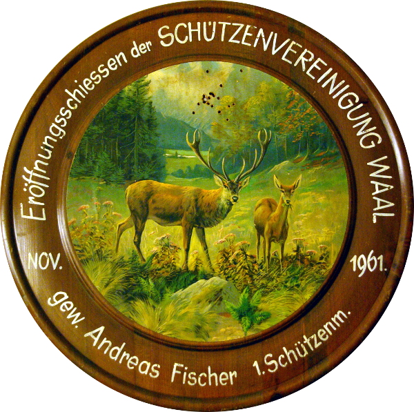 1961 | Gründung der "Vereinigte Schützengesellschaft Waal" Die Schützenlust- und Frohsinnsschützen hatten 1960 eine schlechte Beteiligung bei Gauschießen und anderen öffentlichen Schießen aufzuweisen und beschlossen deshalb im November versuchsweise beide Vereine für eine Saison zusammenzuschließen. Es wurde abwechselnd im Deutschen Haus und im Gasthof Adler geschossen. Diese Regelung hatte sich hervorragend bewährt und so wurde auf Anregung des 2. Schützenmeisters Christian Heinz beschlossen, beide Vereine zusammenzulegen. Somit erfolgte 1961 die Gründung der "Vereinigte Schützengesellschaft Waal" und die Wahl des neuen Vorstands. 1. Schützenmeister wurde Andreas Fischer, 2. Schützenmeister Christian Heinz. | |