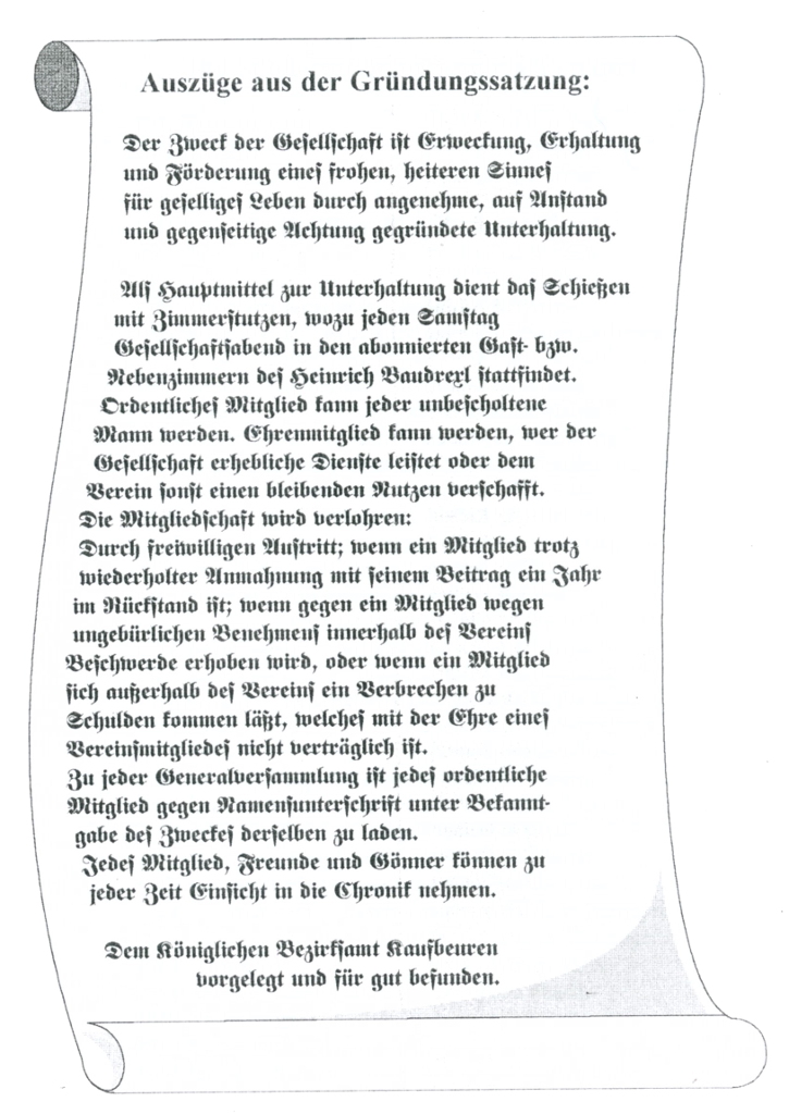 1901 | Bei der Generalversammlung der 2. Zimmerstutzengesellschaft "Frohsinn" am 10. November wurde der Mitgliedsbeitrag erhöht weil die allgemeine Teuerung auch im Verein zu spüren war und nicht zuletzt auch die Helfer besser entlohnt werden sollten. Die Frohsinnsschützen pflegten beste Kameradschaft zu den Vereinen in Bronnen und zur Schützenlust in Waal. Vor Beginn des Schießens wurde jedes Jahr die Generalversammlung, verbunden mit Neuwahlen, abgehalten. Zugleich wurden auch die Gewehre und Ziele , wie z.B. laufender Hirsch, in Ordnung gebracht und jeder Schütze durch Unterschrift auf seine Aufgaben verpflichtet. | |